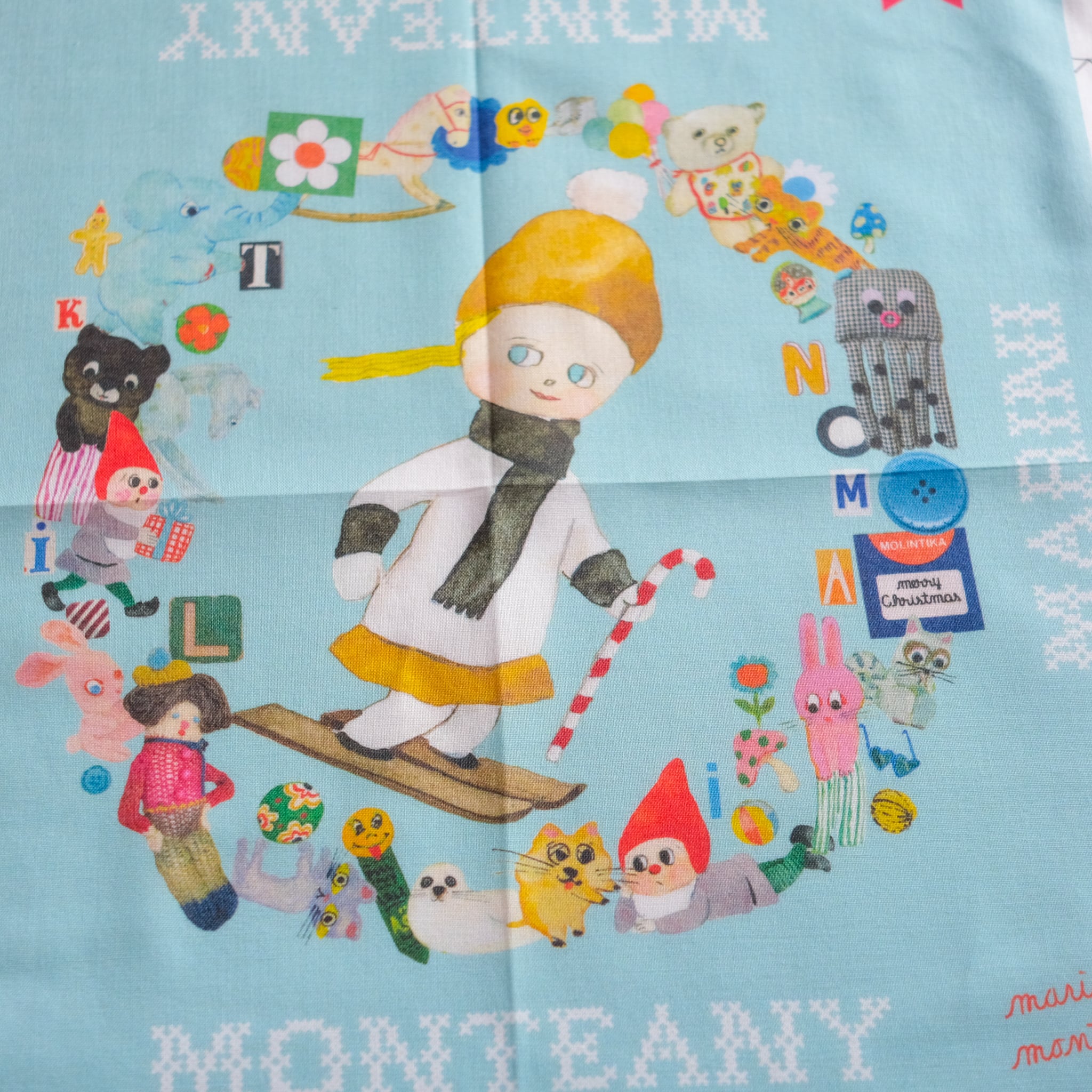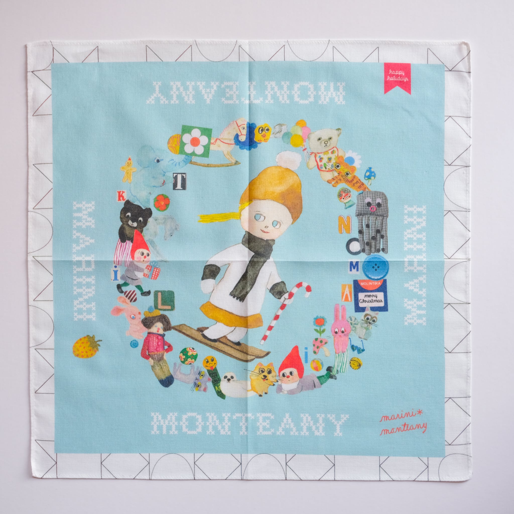 marini*monteanyの絵柄をハンカチにしました。 綿100%の吸水性の良い素地、コンパス生地でサラサラとした優しい肌触のハンカチです。 ハンカチとしてはもちろん、壁に飾ったり、机に広げてみたりと、かわいくお使いいただけると思います。 サイズ:340 × 340mm 素 材:綿